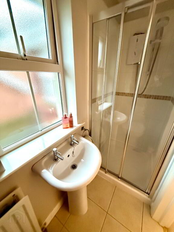En-suite Walk in electric shower, wash hand basin and WC, partly tiled walls, tiled floor.