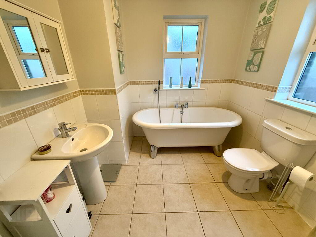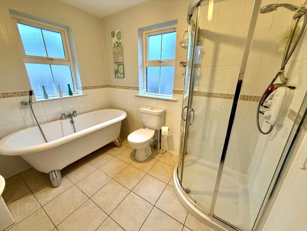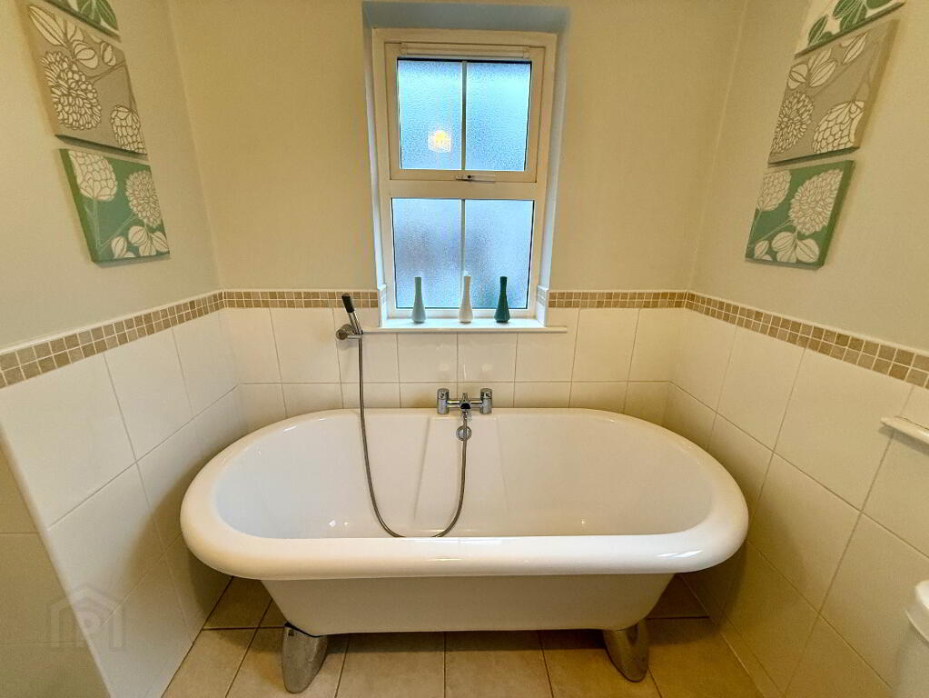 Bathroom Dual aspect, free standing roll top bath, wash hand basin and WC, walk in power shower, partly tiled walls, tiled floor.