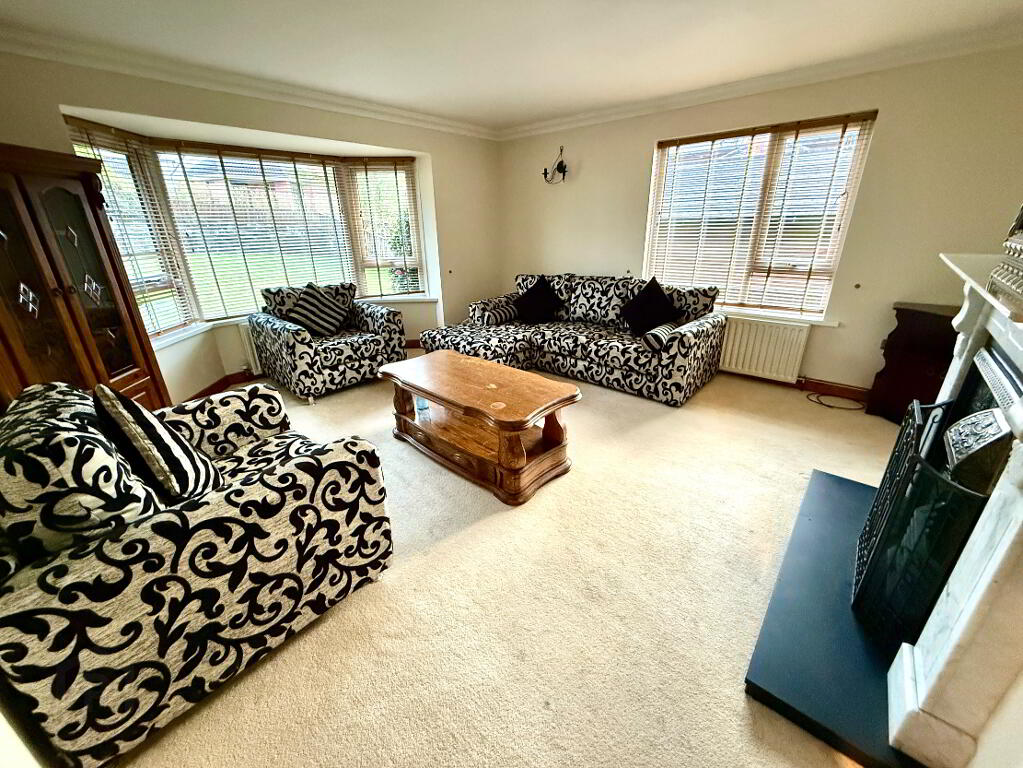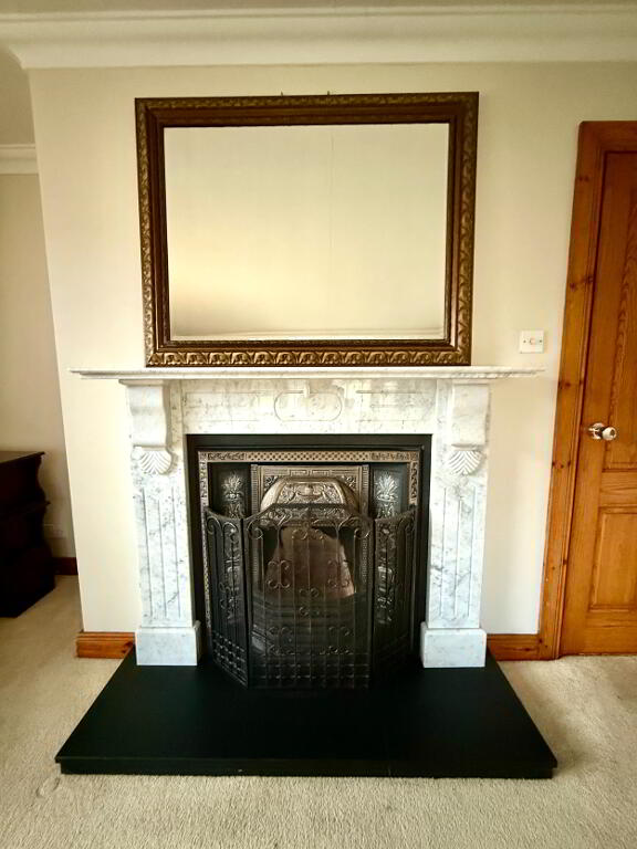 Lounge 15'11 x 14'7 (to widest points) Dual aspect, bay window, cast iron fireplace with marble surround, ceiling cornicing, wall lights.