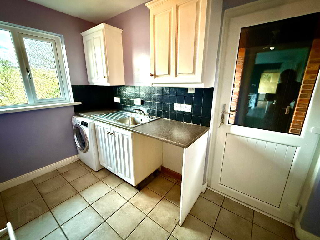 Utility Room Eye and low level units, single drainer stainless steel sink unit with mixer tap, plumbed for washing machine, space for tumble dryer, partly tiled walls, tiled floor.