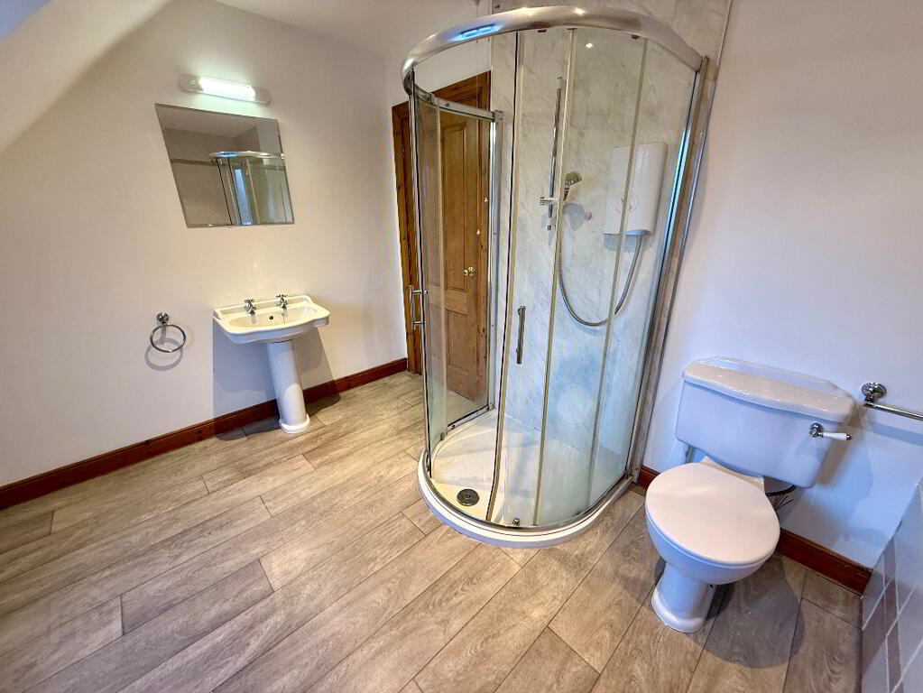 En-suite Walk in electric shower, wash hand basin set in vanity unit, WC.