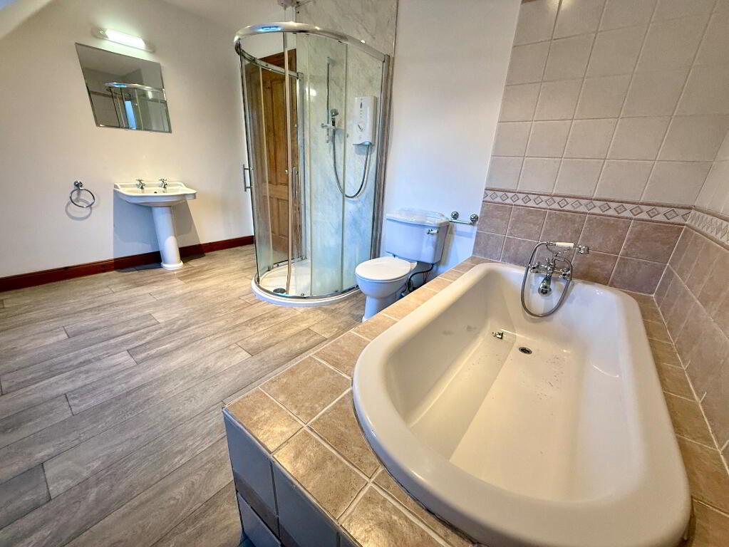 Bathroom 13'1 x 9'6 (to widest points) Bath, wash hand basin and WC, walk in shower, partly tiled walls.