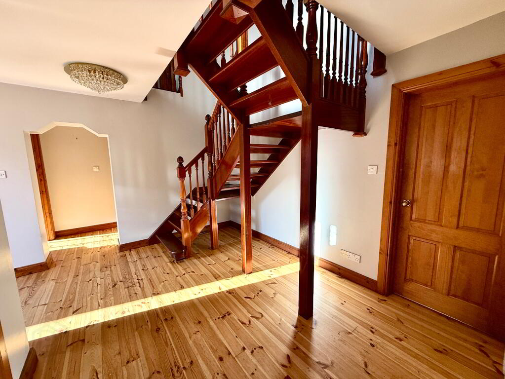 Entrance Hall with open thread staircase, wooden floor.