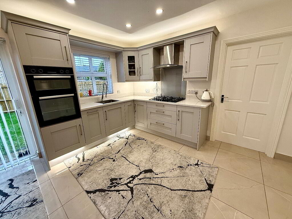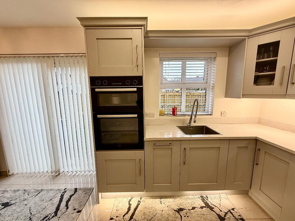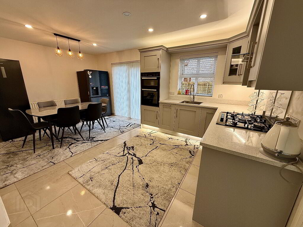 Kitchen/Dining 17'6 x 12'5 (to widest points). Eye and low level units, glazed display unit, stainless steel sink unit with mixer tap, hob, double wall oven, extractor fan, integrated dishwasher, patio doors, tiled floor.