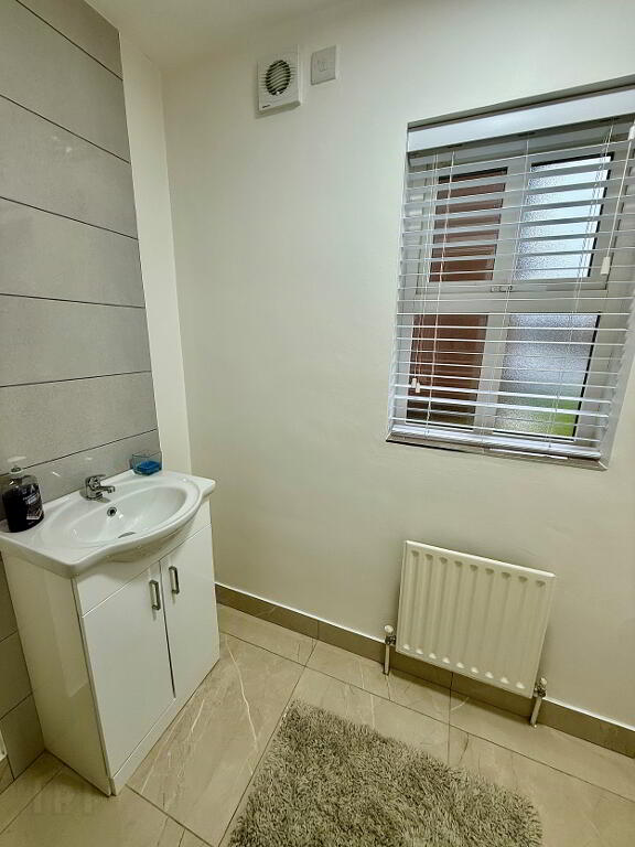 Downstairs WC Wash hand basin set ion vanity unit, WC, partly tiled walls, tiled floor.