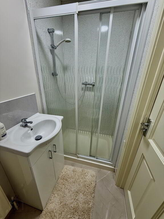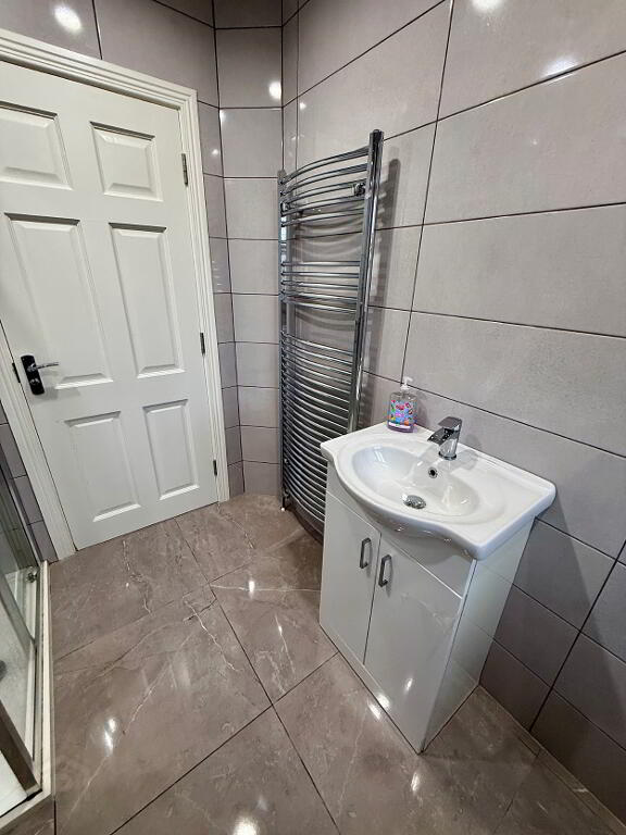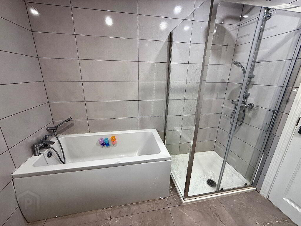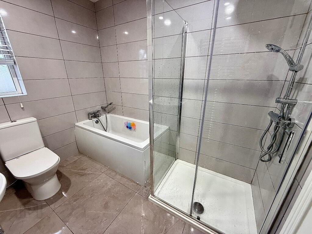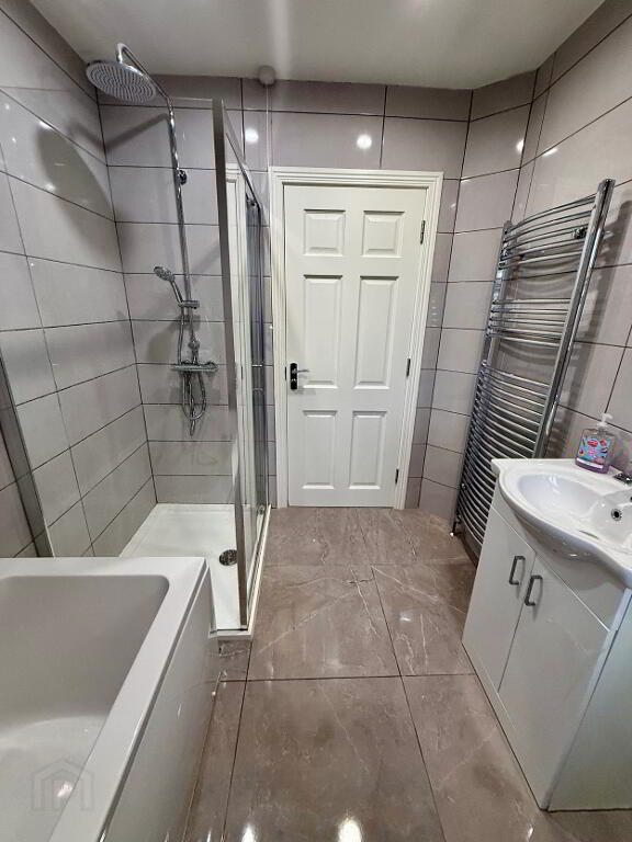 Bathroom Bath, wash hand basin set in vanity unit, WC, fully tiled walk in shower, fully tiled walls, tiled floor, recessed lighting.