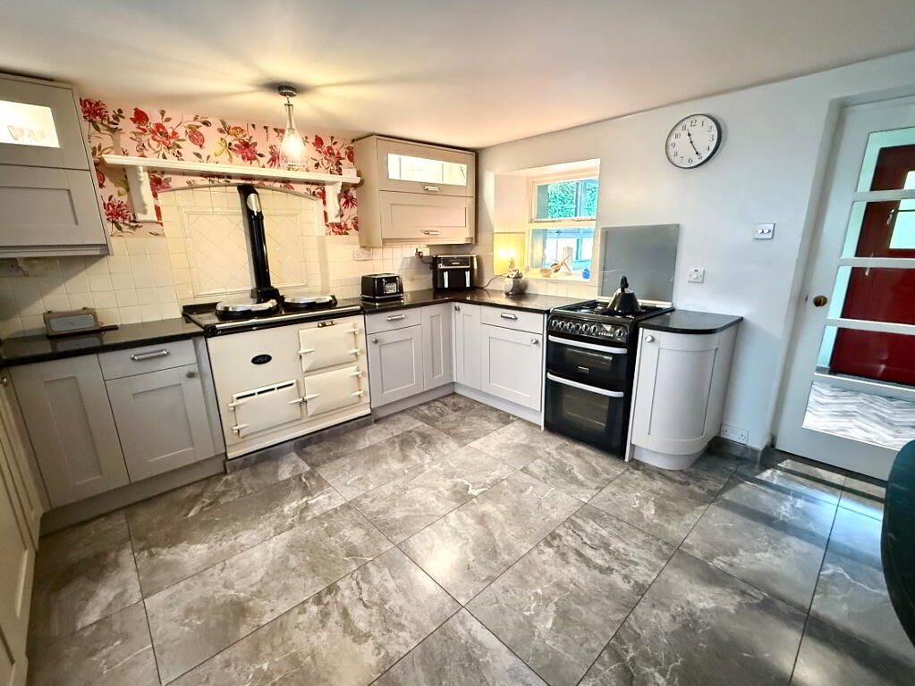 Kitchen 14'10 x 12'6 Eye and low level units, stainless steel sink unit with mixer tap, AGA Range Cooker, wired for electric cooker and piped for gas hob partly tiled walls, tiled floor, pantry, breakfast bar with seating.