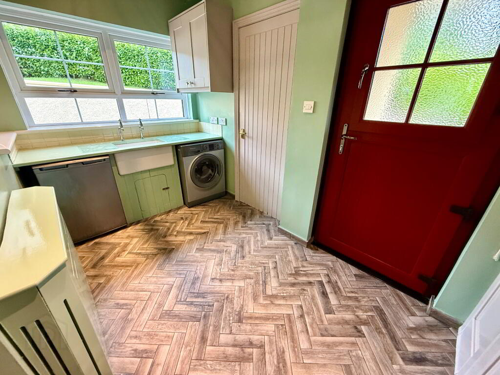 Utility Room 10'9 x 6'6 (to widest points) Belfast sink unit, fitted with wall to wall storage cupboards, partly tiled walls, tiled floor.