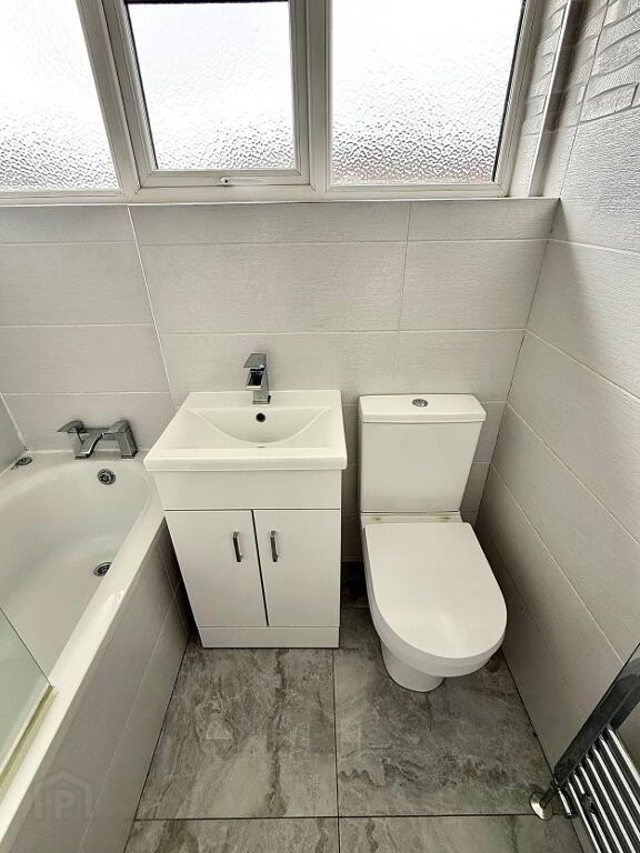 Bathroom Bath with electric shower overhead, wash hand basin and WC, fully tiled walls, tiled floor, heated towel rail.