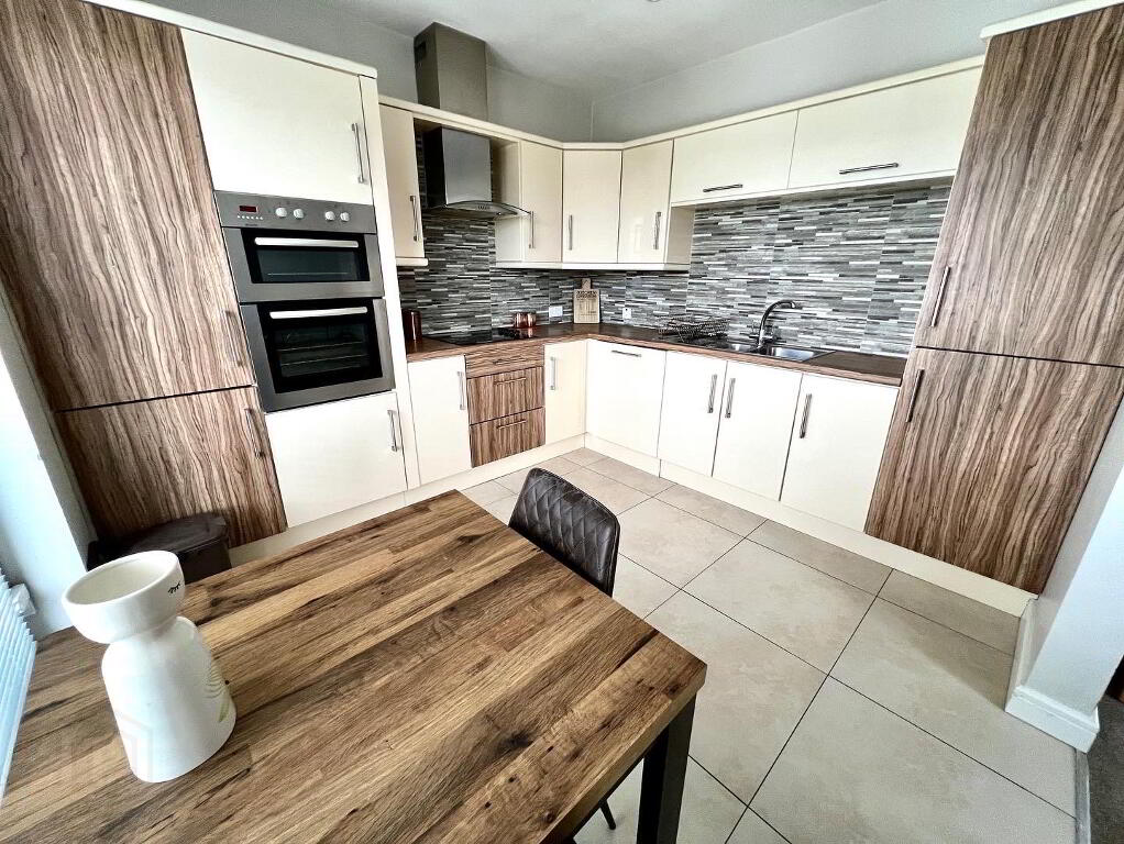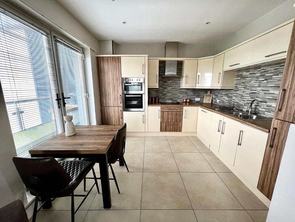 Lounge/Kitchen/Dining 24'4 x 10'8 Corner window, recessed lighting, eye and low level units, 1 1/2 bowl stainless steel sink unit with mixer tap, hob, oven and extractor fan, integrated dishwasher, integrated fridge/freezer, partly tiled walls, tiled floor in kitchen/dining area, patio doors.