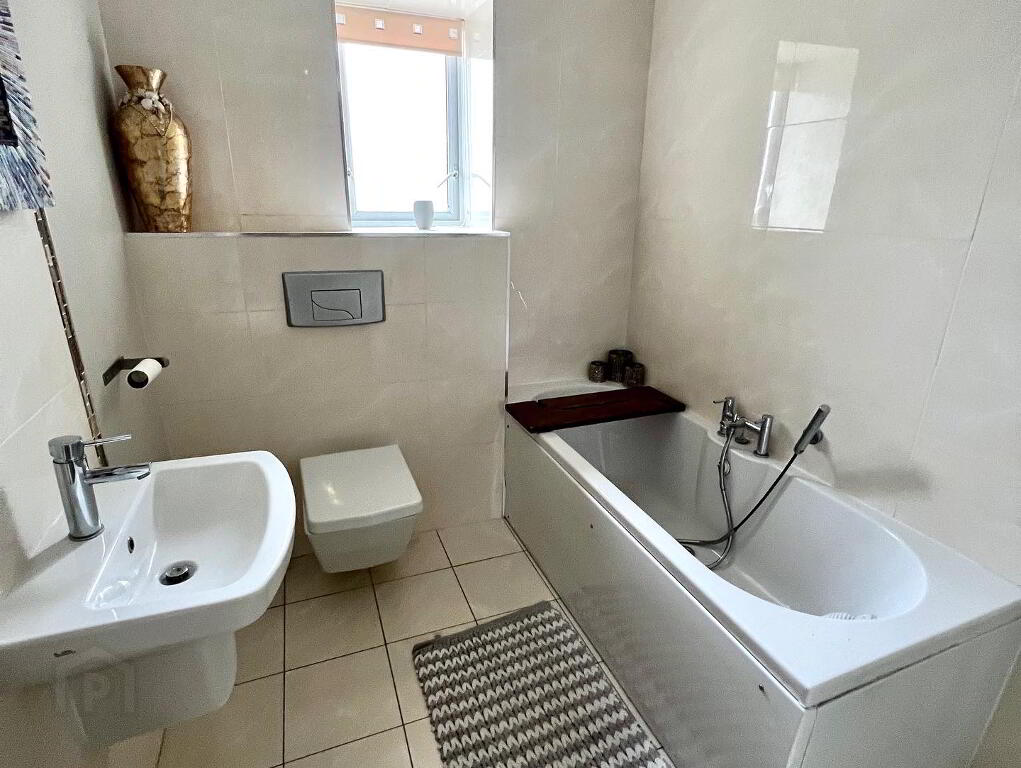 Bathroom Bath, wash hand basin and WC, fully tiled walk in electric shower, partly tiled walls, tiled floor, recessed lighting.