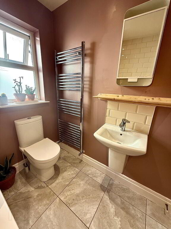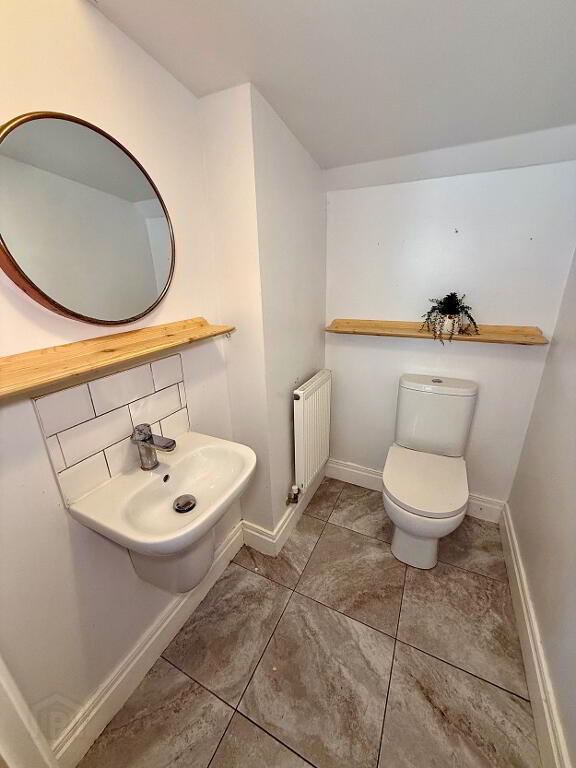 Downstairs WC Wash hand basin and WC, tiled floor.