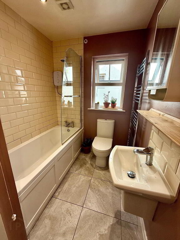 Bathroom Bath with electric shower overhead, wash hand basin and WC, heated towel rail, tiled floor, partly tiled wall, storage cupboord.