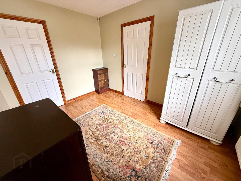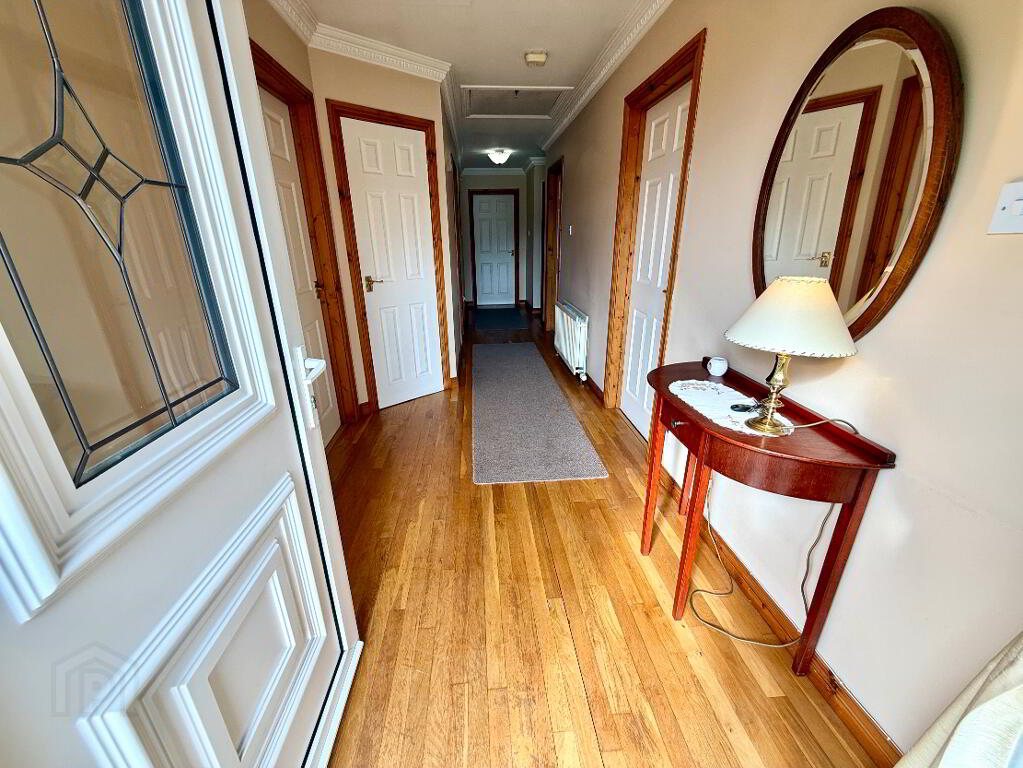 Entrance Hall with cloak cupboard, hotpress, ceiling cornicing, wooden floor.