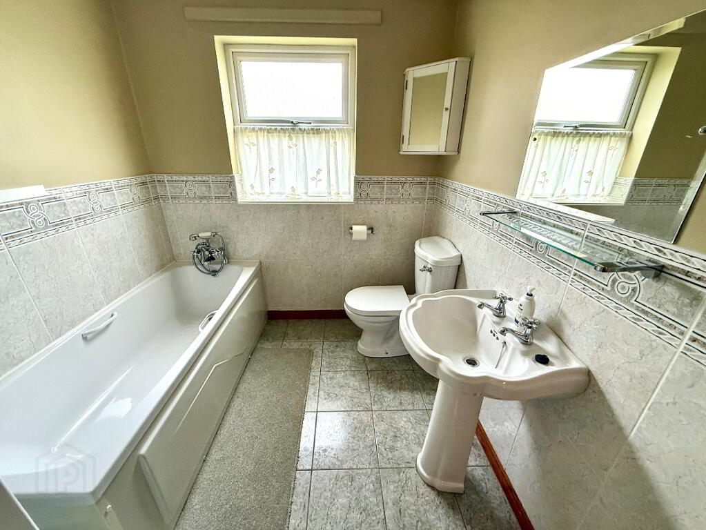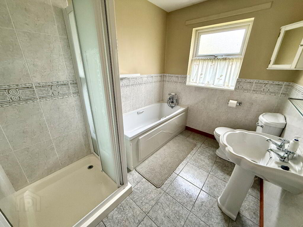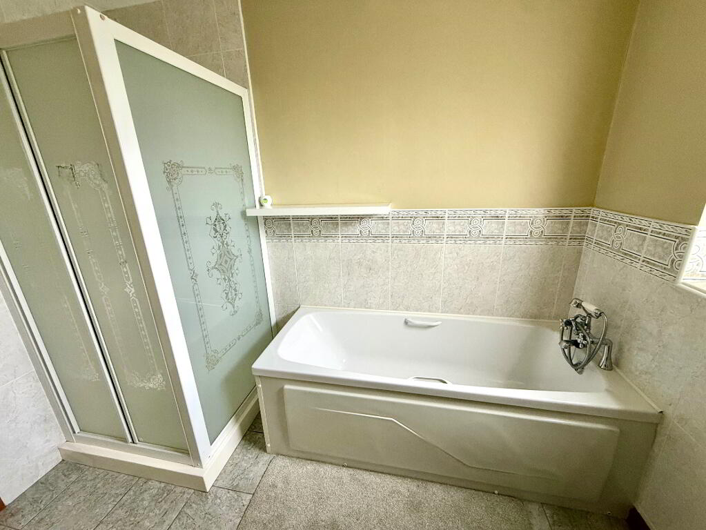 Bathroom Bath with shower attachment to tap, wash hand basin and WC, fully tiled walk in electric shower, partly tiled walls, tiled floor.