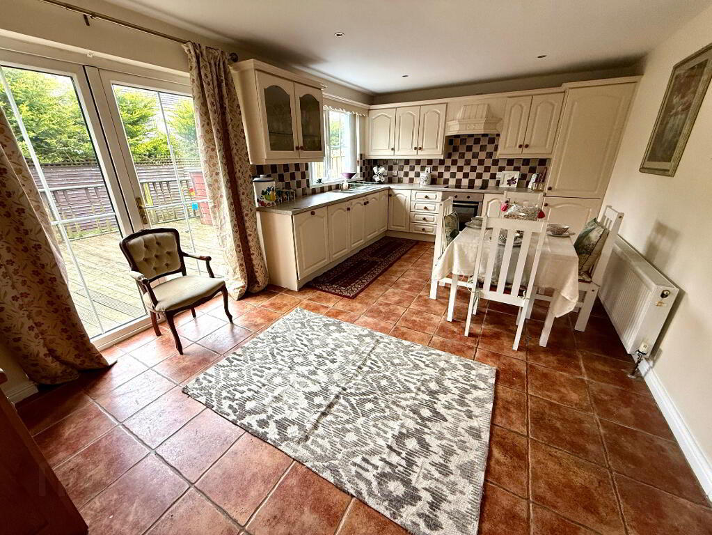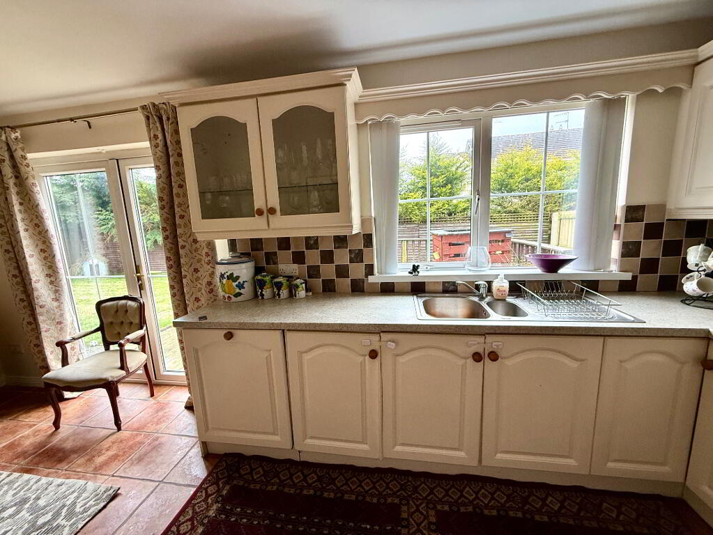 Kitchen/Dining 18'4 x 11'4 Eye and low level unit, glazed display units, 1 1/2 bowl stainless steel sink unit with mixer tap, hob, oven, integrated dishwasher, partly tiled walls, tiled floor, double patio doors.