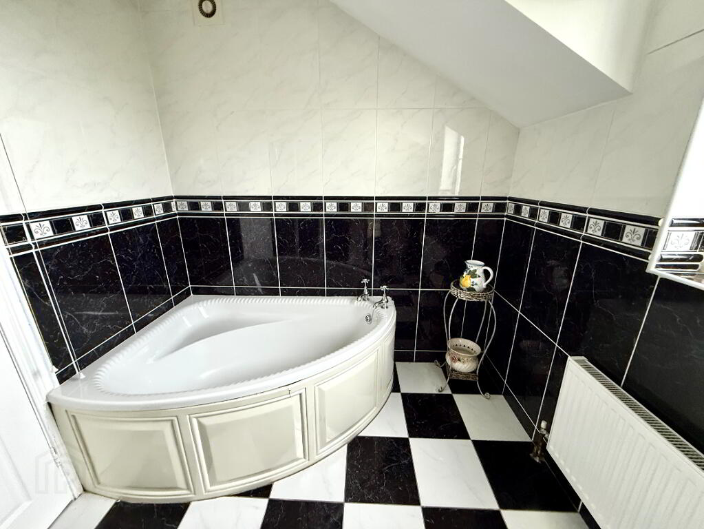 Bathroom Corner bath, wash hand basin and WC, walk in electric shower, fully tiled walls, tiled floor, recessed lighting.