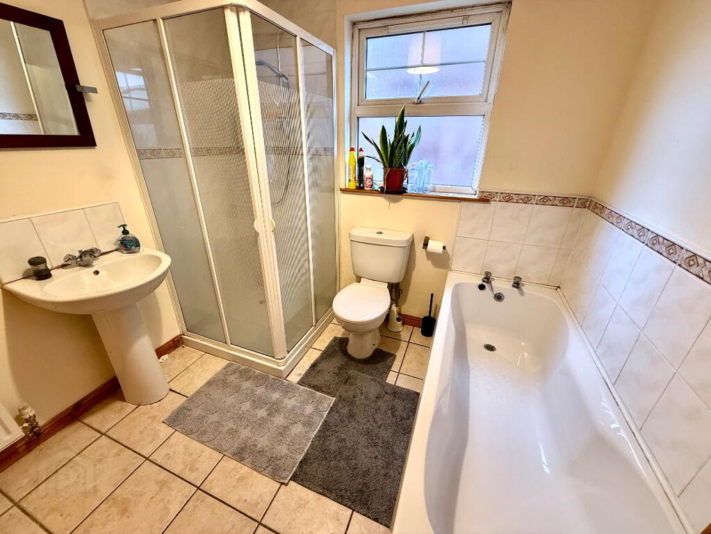 Bathroom Bath, wash hand basin and WC, fully tiled walk in shower, partly tiled walls, tiled floor.