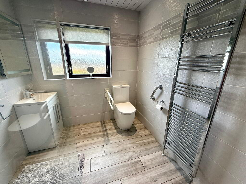 Shower Room Fully tiled walk in shower, wash hand basin set in vanity unit, WC, fully tiled walls, tiled floor, heated towel rail, recessed lighting.