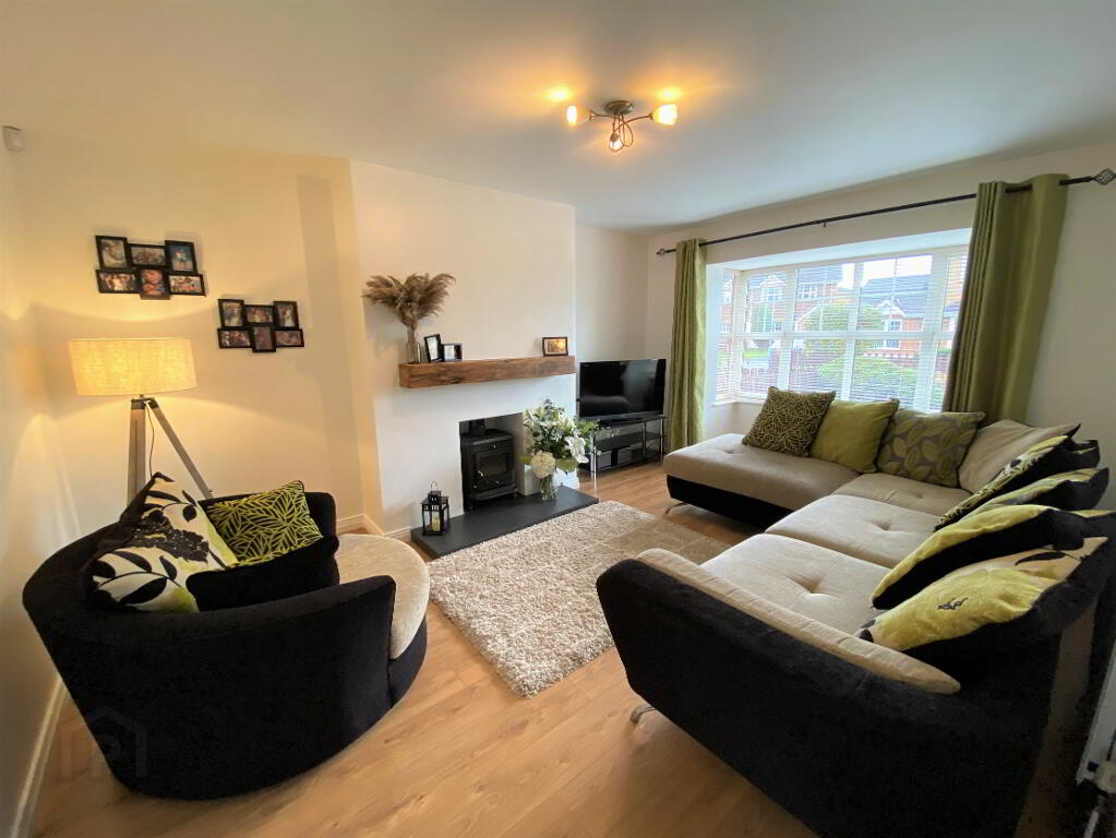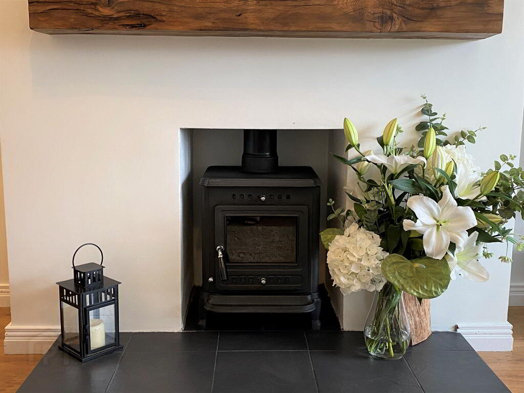 Lounge 17'7 x 12' (to widest points) Box window, woodburning stove, laminated wooden floor