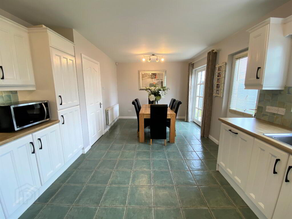 Kitchen/Dining 19'11 x 10' Eye and low level units, glazed display unit, open display shelves, wine rack, 1 1/2 bowl stainless steel sink unit with mixer tap, hob, oven and extractor fan, intergraded fridge/freezer, integrated dishwasher, plumbed for washing machine, partly tiled walls, tiled floor, patio doors