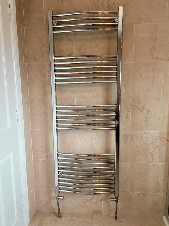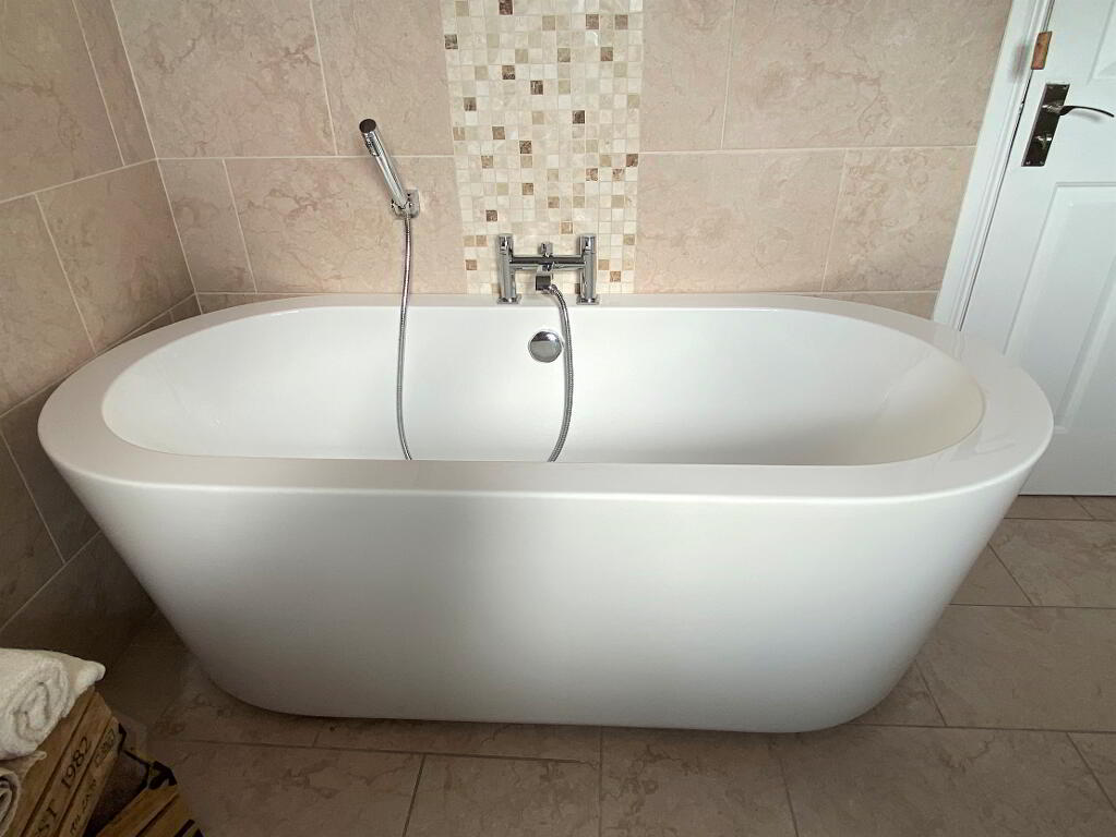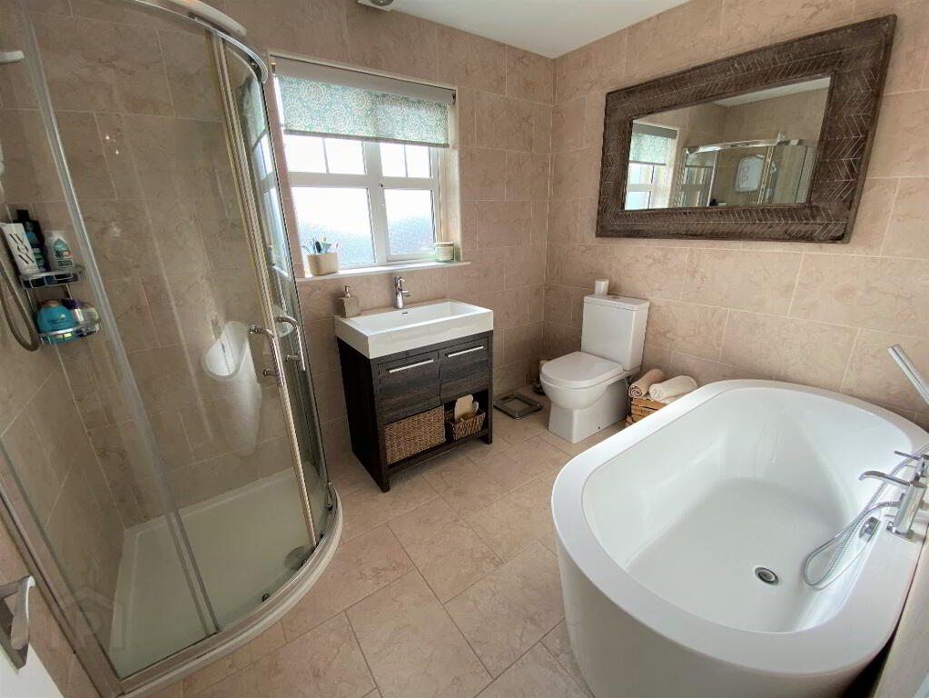 Bathroom Free standing bath, wash hand basin set in vanity unit, WC, fully tiled walk in electric shower, heated towel rail, fully tiled walls, filed floor