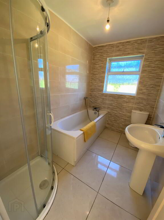 Bathroom White suite comprising of bath, wash hand basin, WC, walk in electric shower, fully tiled walls, tiled floor