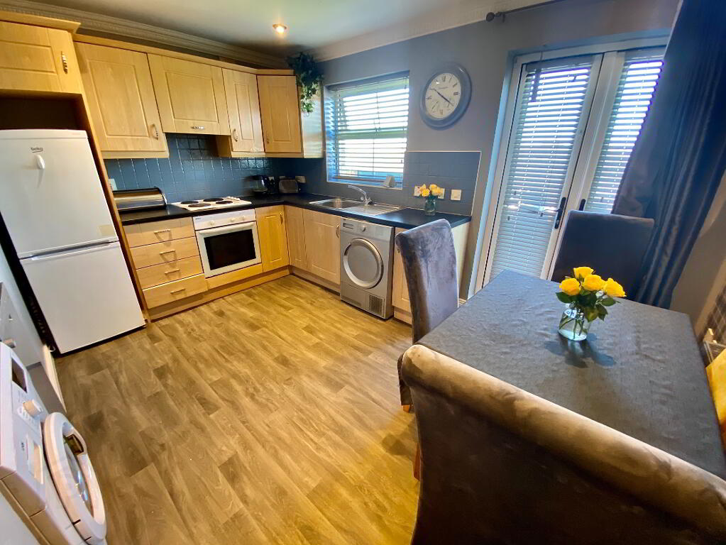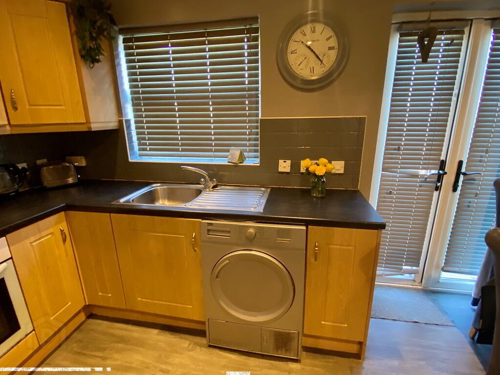 Kitchen/Dining 13'1 x 10'10 Eye and low level units, single drainer stainless steel sink unit with mixer tap, hob, oven and extractor fan, plumbed for washing machine, space for tumble dryer, partly tiled walls, ceiling cornicing