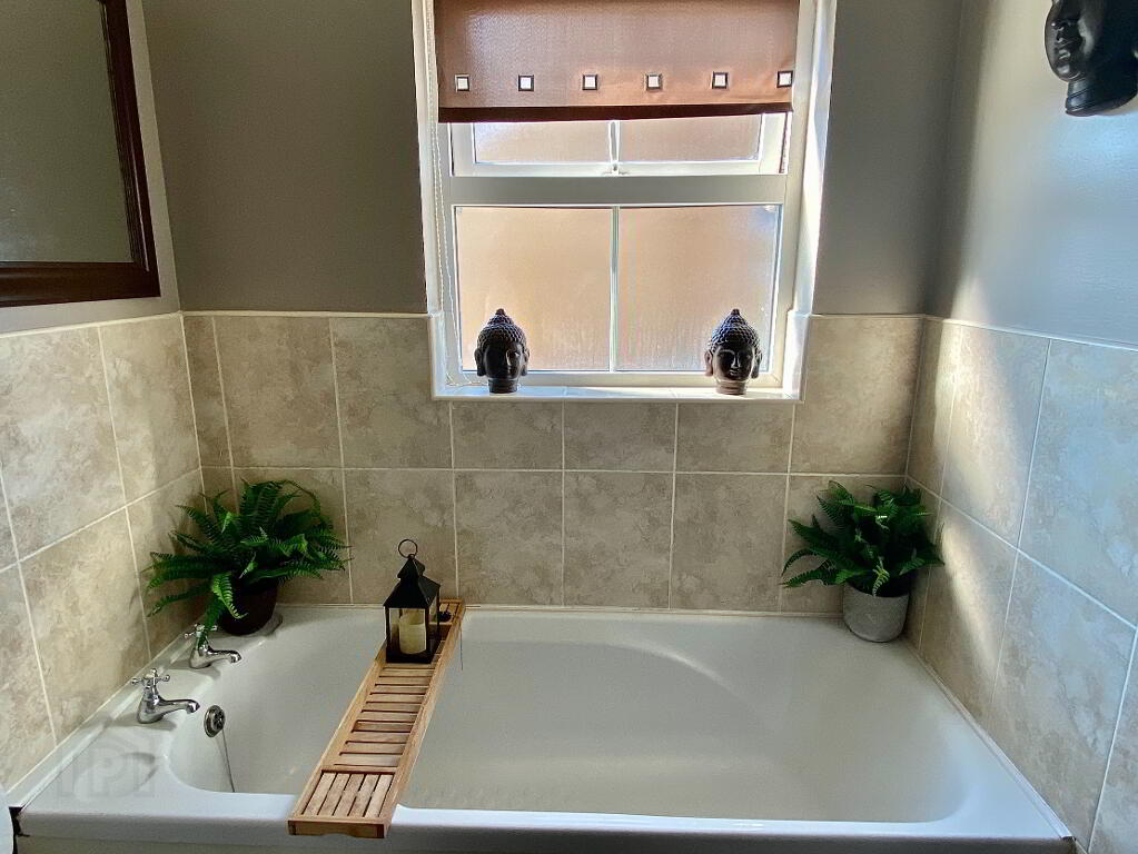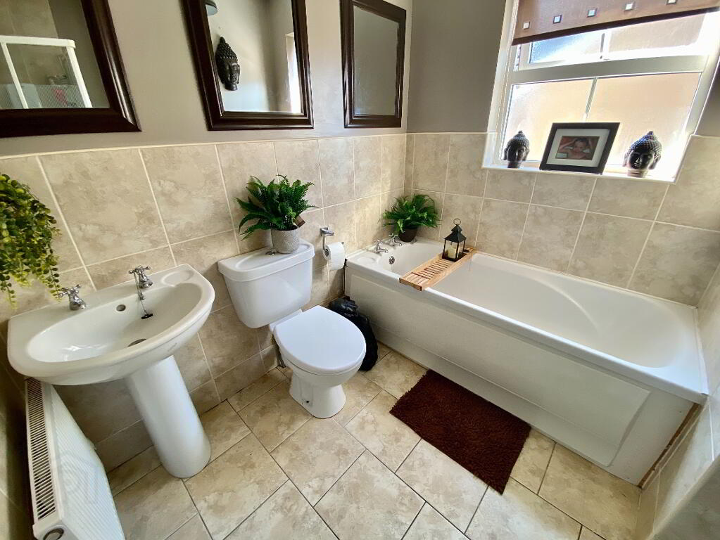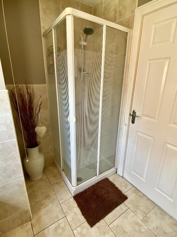 Bathroom Bath, wash hand basin and WC, fully tiled walk in electric shower, partly tiled walls, tiled floor