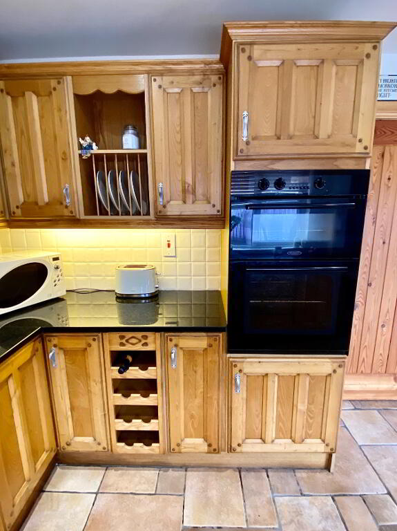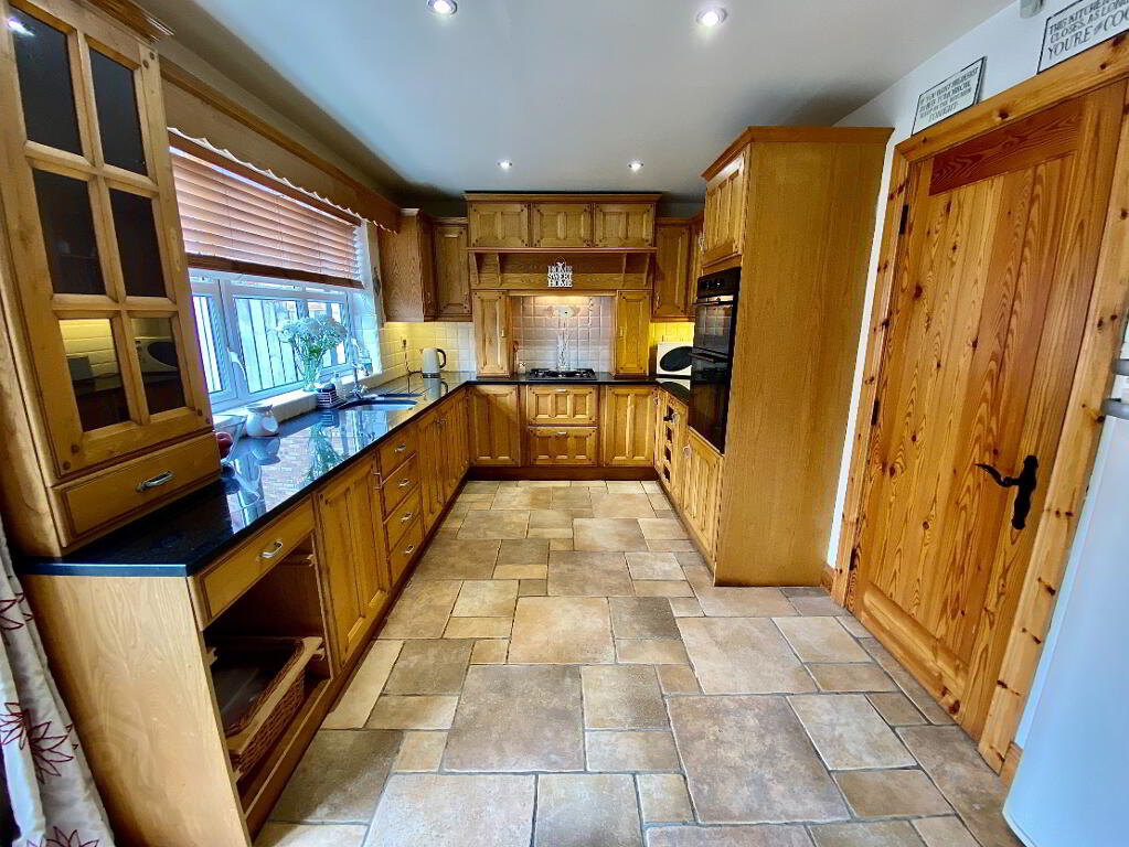 Kitchen/Dining 20'9 x 10'9 (to widest points) Eye and low level units, 1 1/2 bowl stainless steel sink unit set in granite worktop, hob, double wall oven and extractor fan, concealed lighting below eye level units, open display shelves, wine rack, centre island with seating, double patio doors, partly tiled walls, tiled floor, recessed lighting