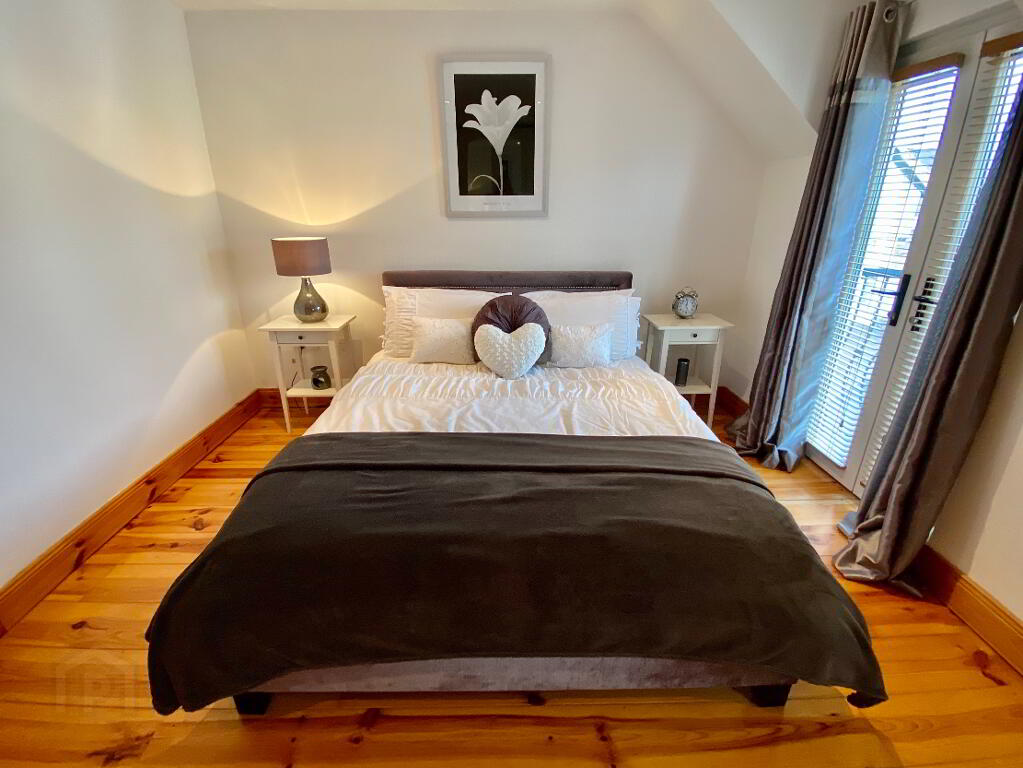 Bedroom 1 17'9 x 11' (to widest points) Fitted with wall to wall built in wardrobes and drawers, double doors to Juliet balcony, wooden floor, recessed lighting. En-suite; Fully tiled walk in shower, wash hand basin, WC, fully tiled walls, tiled floor, recessed lighting