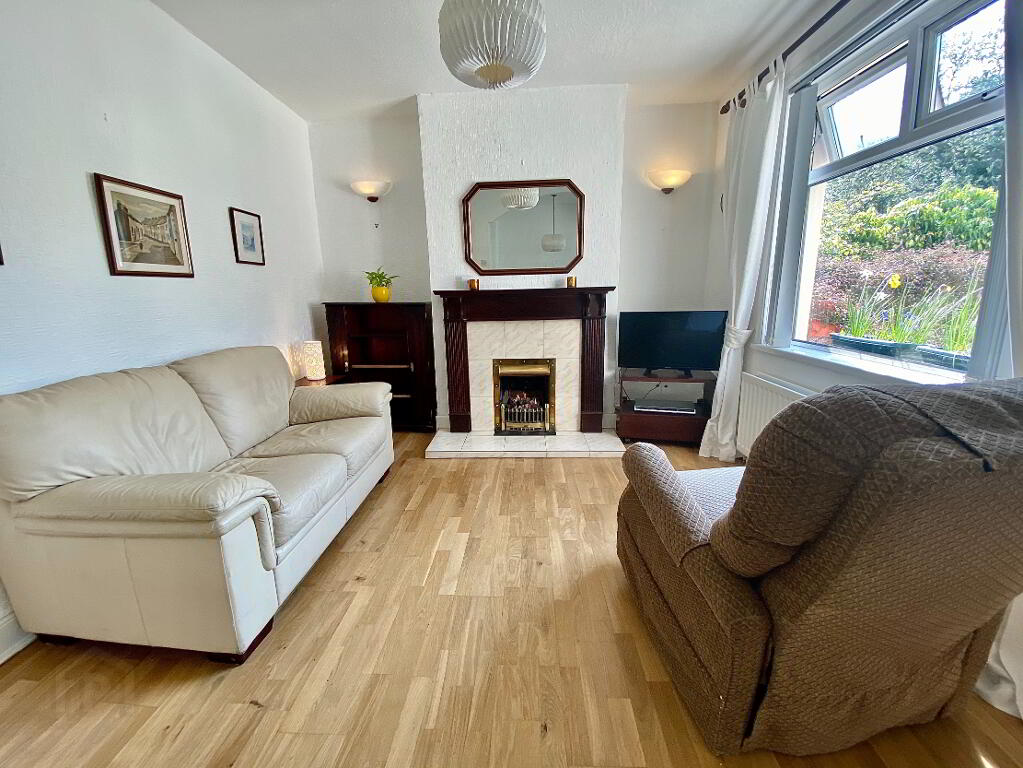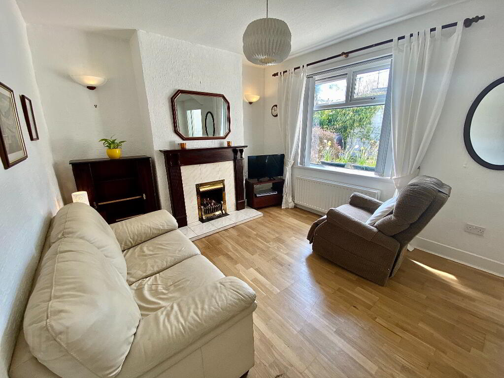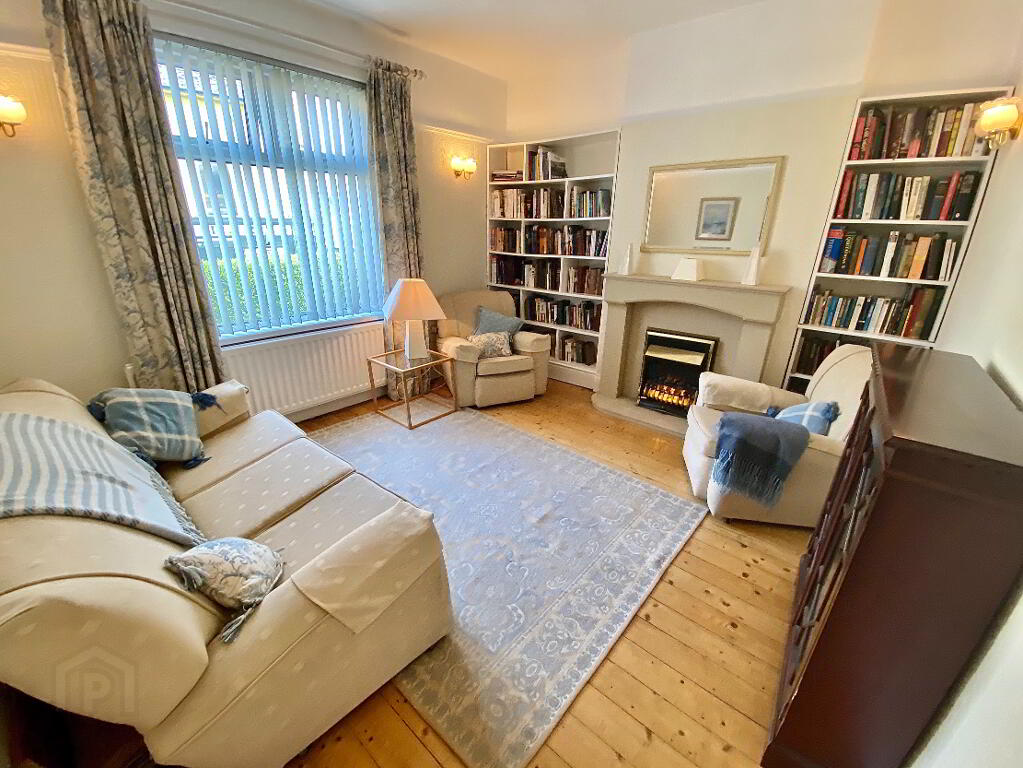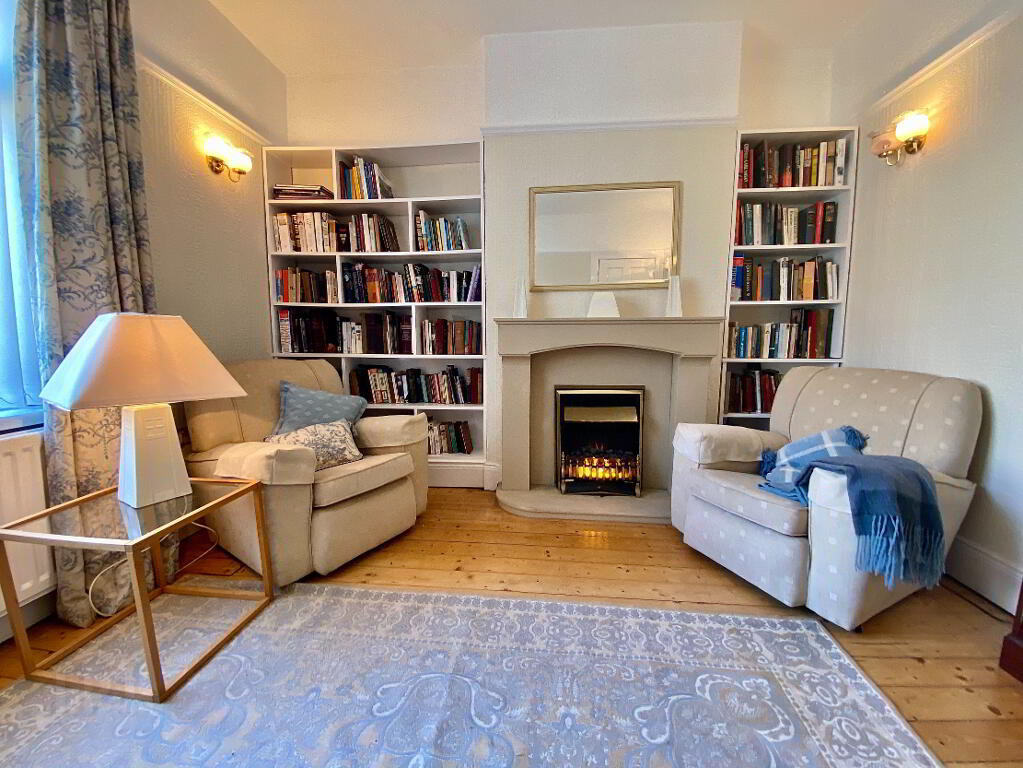Lounge 12'3 x 10'11 (to widest points) Wall lights, books shelves, fireplace with electric fire, picture rail