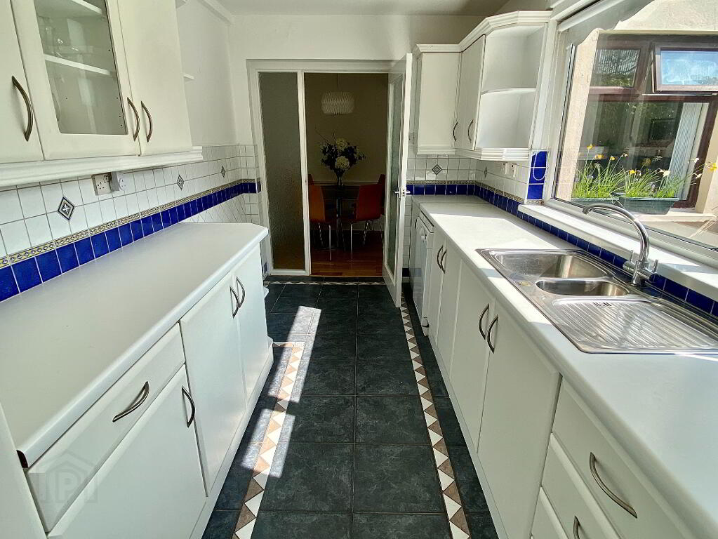 Kitchen 14'6 x 7'3 Eye and low level units, 1 1/2 bowl stainless steel sink unit with mixer tap, open display shelves, glazed display unit, wired for electric cooker, partly tiled walls, tiled floor