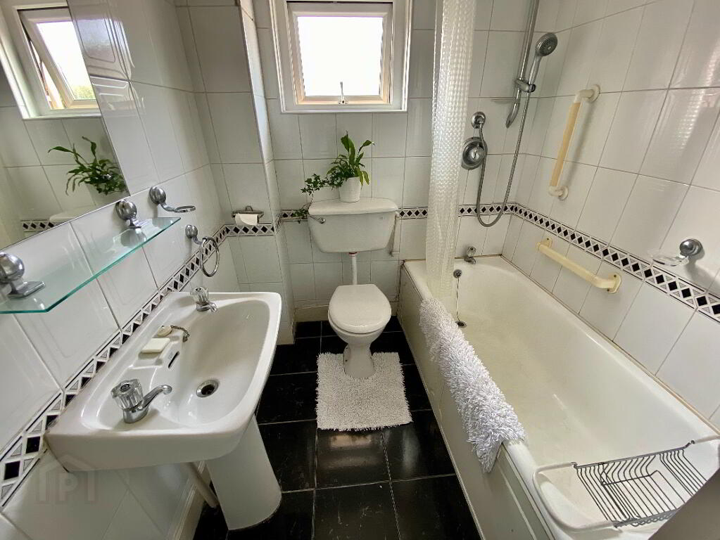 Bathroom Bath, wash hand basin and WC, shower over bath, fully tiled walls, tiled floor