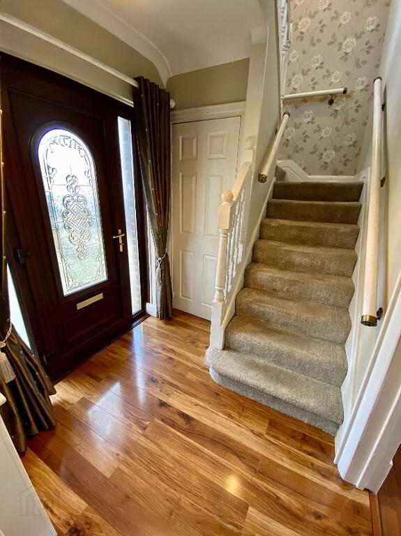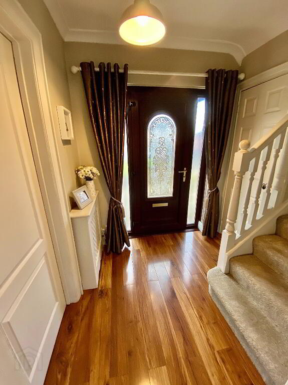 Entrance Hall with laminated wooden floor, under stair cloak cupboard, radiator cover