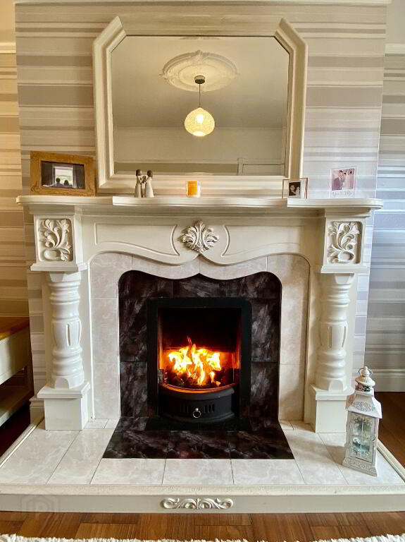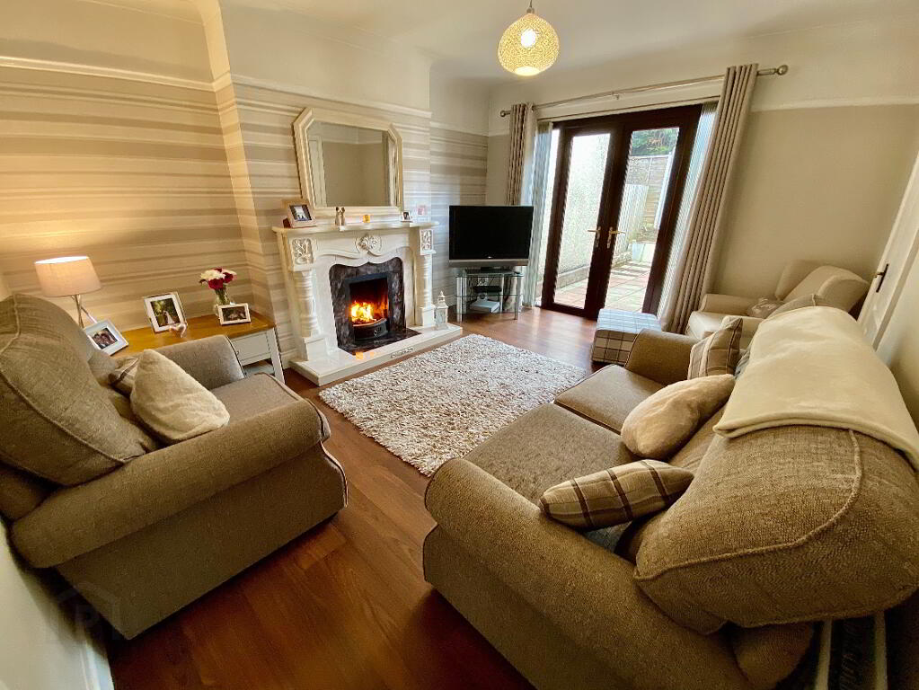 Lounge 14'3 x 11'11 (to widest points) Tiled fireplace and hearth with wooden surround, double patio doors, ceiling cornicing and picture rail