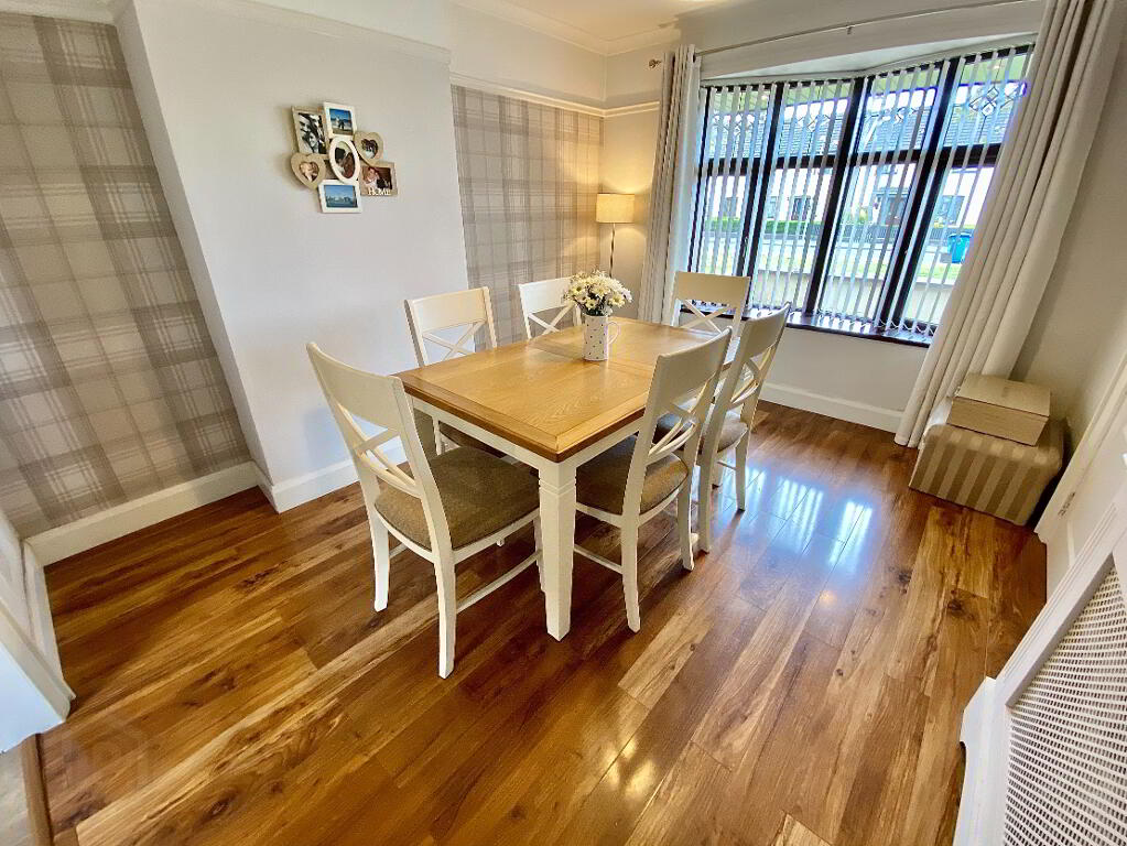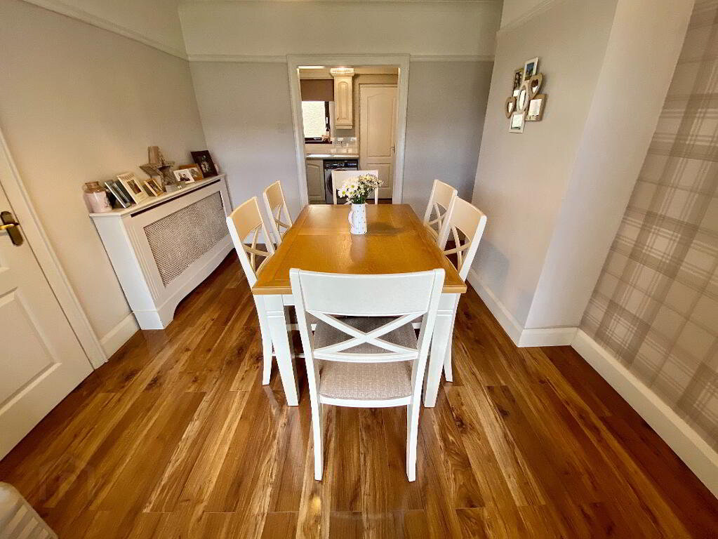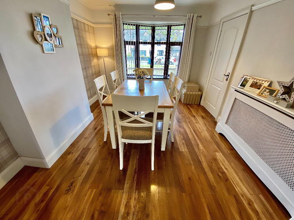 Family Room/Dining Room 12'8 x 10'5 Bow window, laminated wooden floor, radiator cover, ceiling cornicing, picture rail, archway to kitchen
