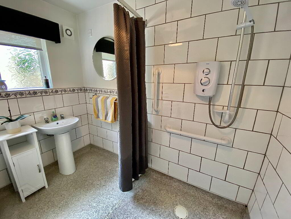Downstairs Shower Room 8'3 x 6'5 Fully tiled walk in electric shower, wash hand basin and WC, partly tiled walls