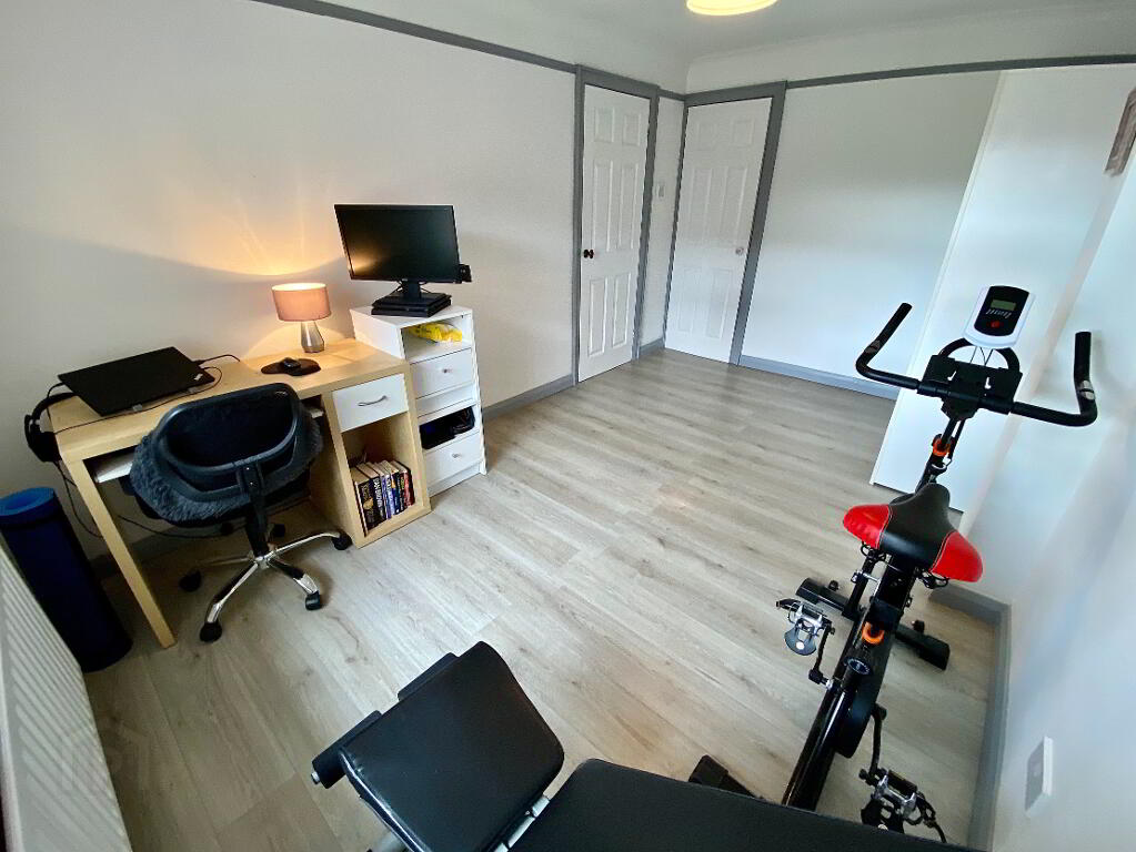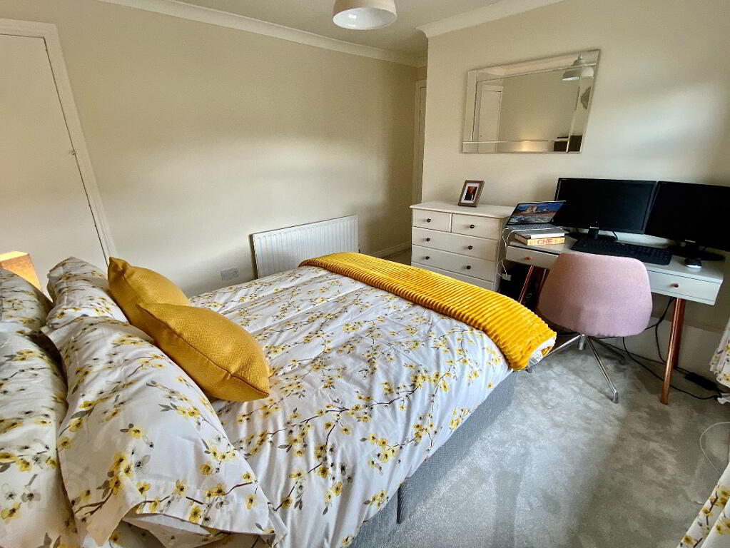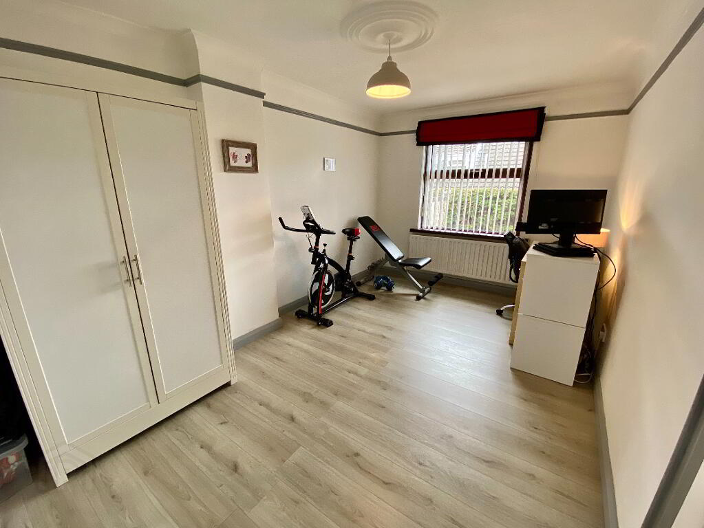 Bedroom 2 14'3 x 8'9 Laminated wooden floor, built in storage cupboard, picture rail, ceiling cornicing