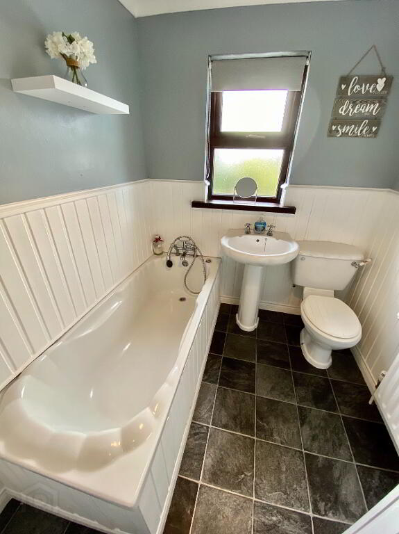 Bathroom Bath, wash hand basin and WC, walls partially wood panelled, storage cupboard, ceiling cornicing
