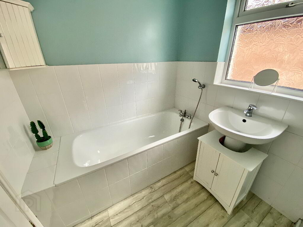 Bathroom Bath, wash hand basin and WC, fully tiled walk in electric shower, heated towel rail, partly tiled walls