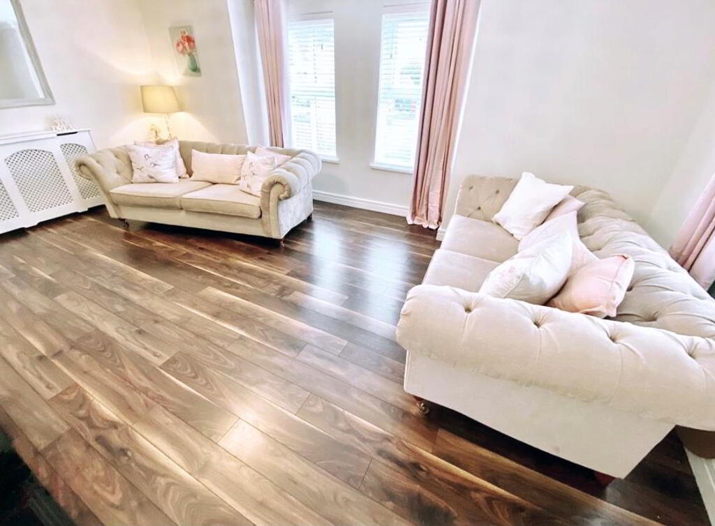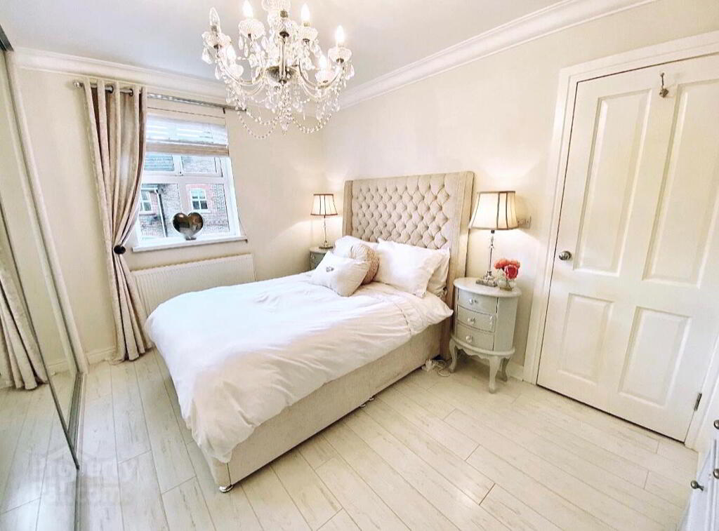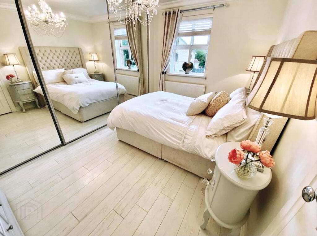 Bedroom 2 12'10 x 8'5 Fitted with wall to wall mirror sliderobes, laminated wooden floor, ceiling cornicing