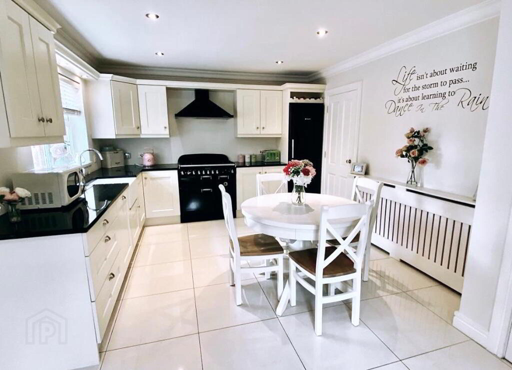 Kitchen/Dining/Family Room 24'7 x 18'5 (to widest points) Eye and low level units, window pelmet with lighting, Belfast sink with mixer taps set in granite worktop, 'Rangemaster' cooker and extractor fan, integrated dishwasher, fridge/freezer, wine rack, tiled floor, understair storage, archway to family area with multi fuel stove, patio doors, tiled floor, ceiling cornicing