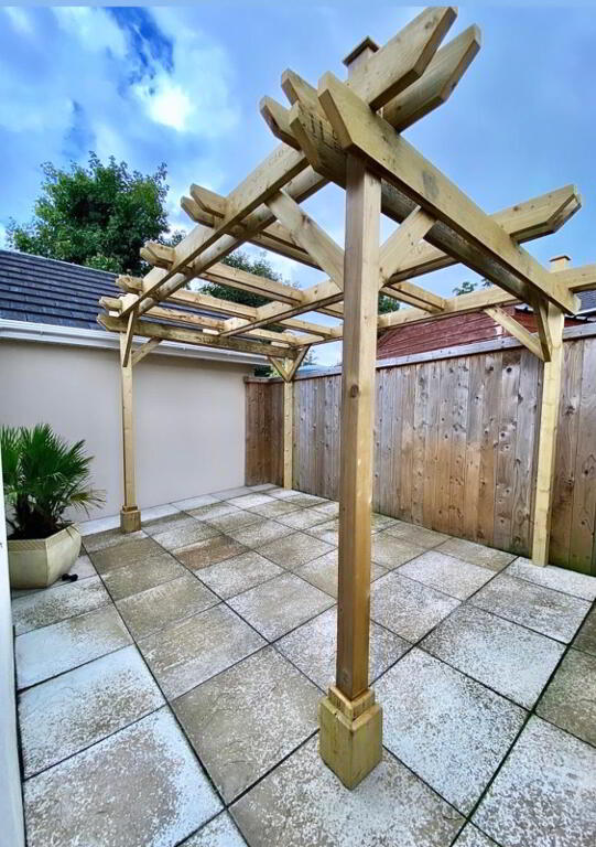 Paved patio area with pergola enclosed by fence