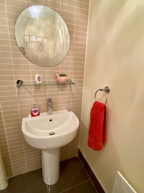 Downstairs WC WC and wash hand basin, partly tiled walls, tiled floor