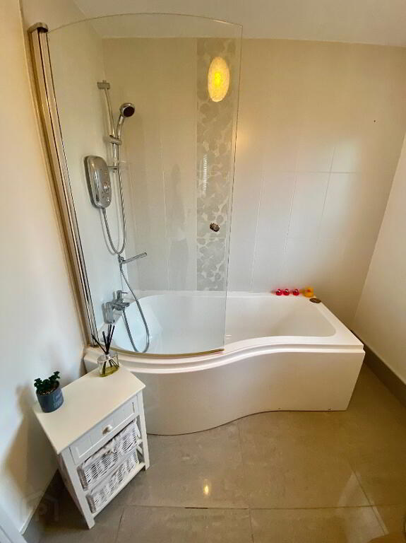 Bathroom 8' x 7' bath with electric shower over head, wash hand basin and wc, partly tiled walls, tiled floor