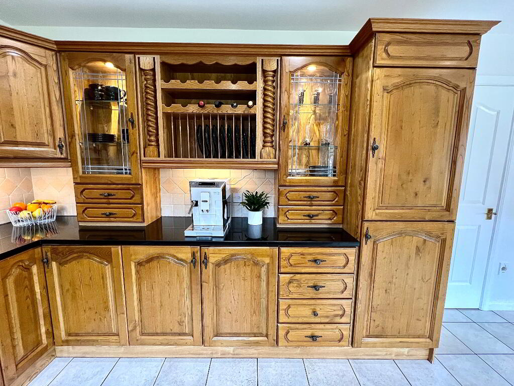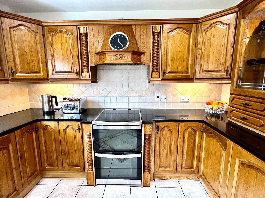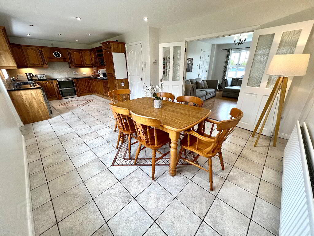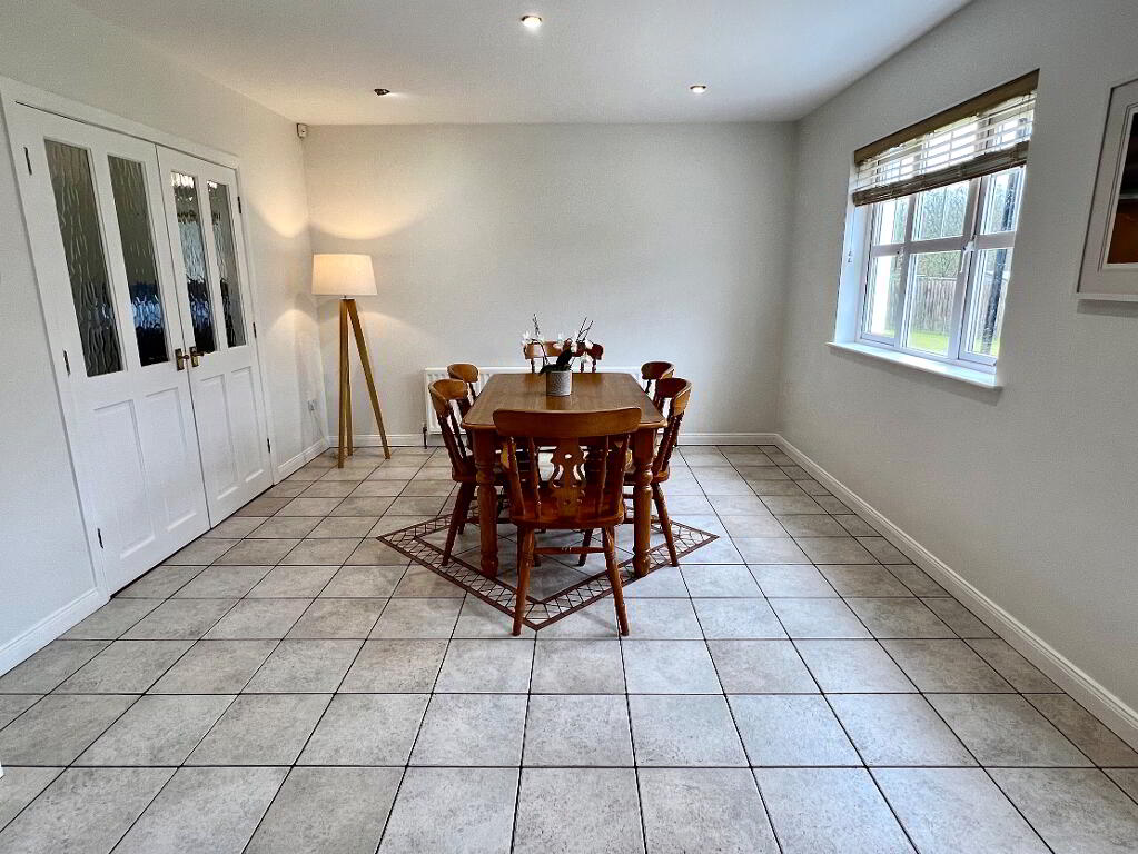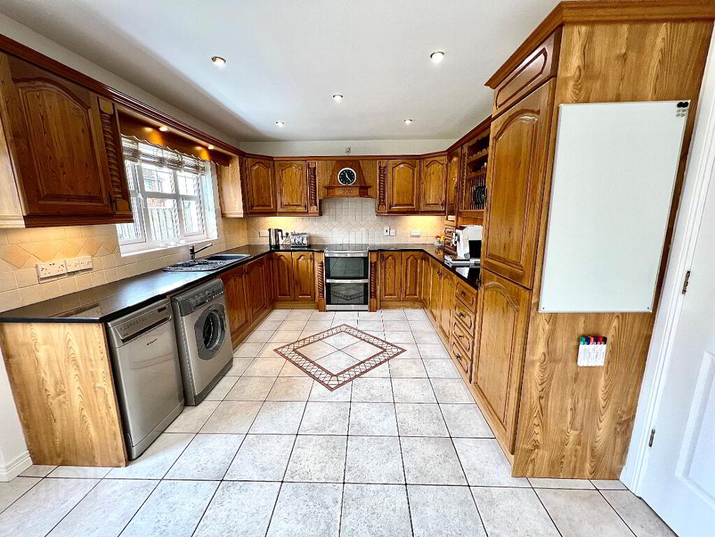 Kitchen/Dining 26'6 x 12' (to widest points) eye and low-level units, glazed display units with lighting, wine rack and plate rack, concealed lighting below eye level units, 1 1/2 bowl coloured sink unit with mixer tap set in granite worktop, wired for electric cooker, plumbed for washing machine, plumbed for dishwasher, partly tiled walls, tiled floor, recessed lighting.