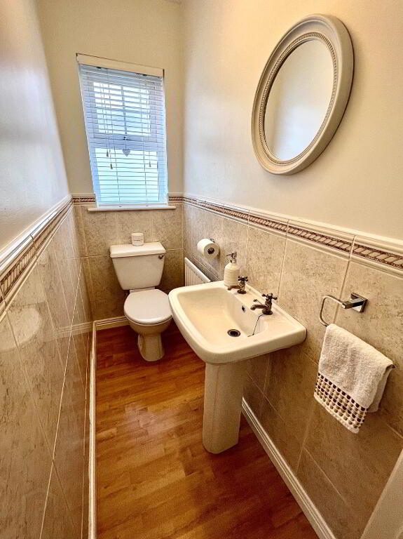Downstairs WC WC and wash hand basin, partly tiled walls, laminated wooden floor.