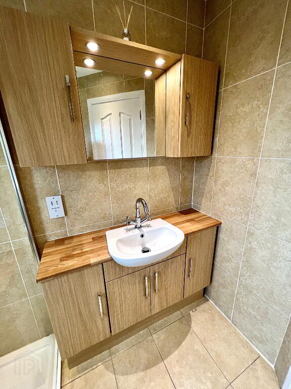 Bedroom 1 13'10 x 12'1 (to widest points) laminated wooden floor, double built in wardrobe En-suite fully tiled walk in shower, wash hand basin set in vanity unit with matching wall unit, WC, fully tiled walls, tiled floor