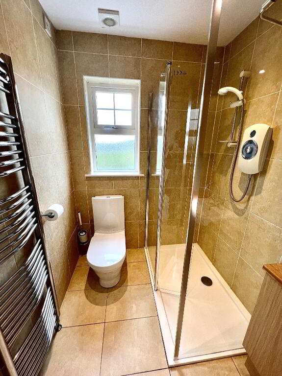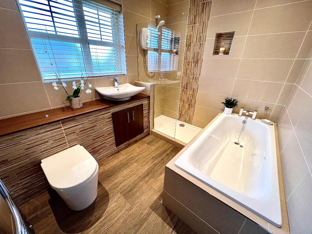 Bathroom 9' x 7'1 bath, wash hand basin set in vanity unit, WC, walk in electric shower, fully tiled walls, tiled floor, recess lighting, heated towel rail.